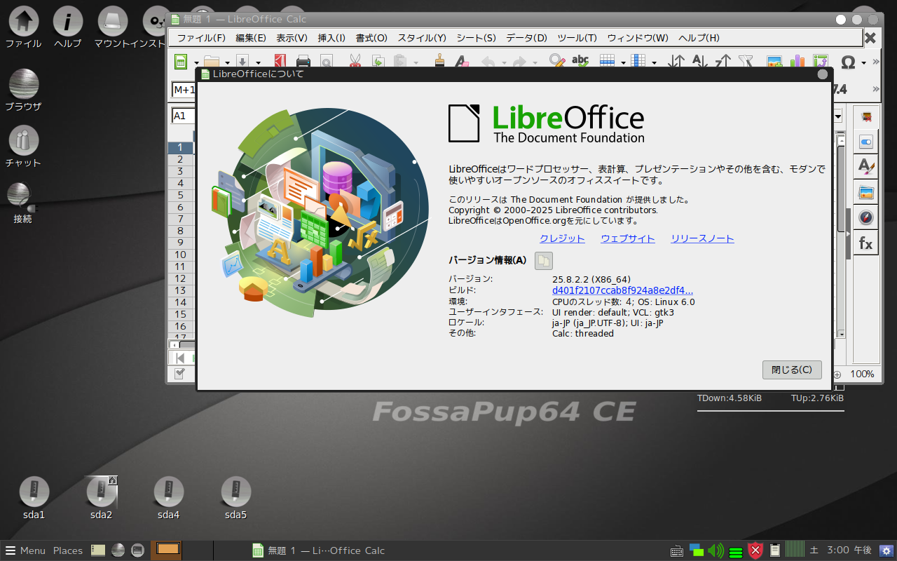 LibreOffice LibreOfficeの更新があったので(25.8.2) LibreOffice のアップデート(25.8.2)があったようなので、自分で使用するPuppyLinuxにインストールするSFSファイル(25.8.2)を作成。ノートン様でチェック後アップロードしています。Puppy Linux Fos... 2025.10.11 LibreOfficeOfficePuppyLinux