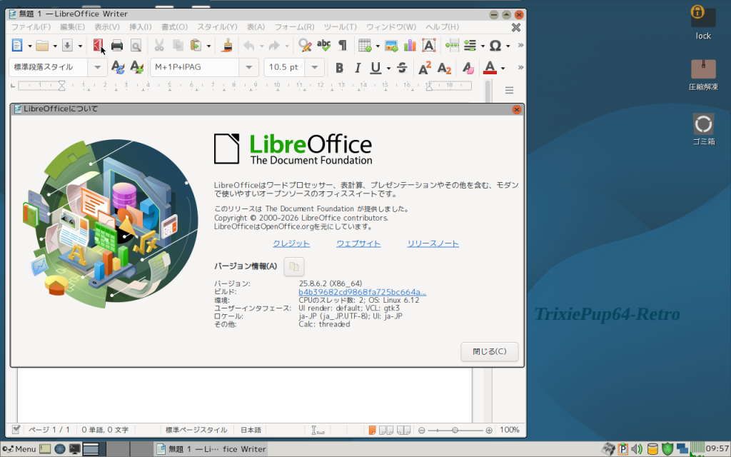 LibreOfficeLibreOffice のアップデート(25.8.6)があったようなので、自分で使用するPuppyLinuxにインストールするSFSファイル(25.8.6)を作成。ノートン様でチェック後アップロードしています。Puppy Linux TrixiePup64-Retro + 日本語フォント に インストールして起動してみた様子は以下の画像。