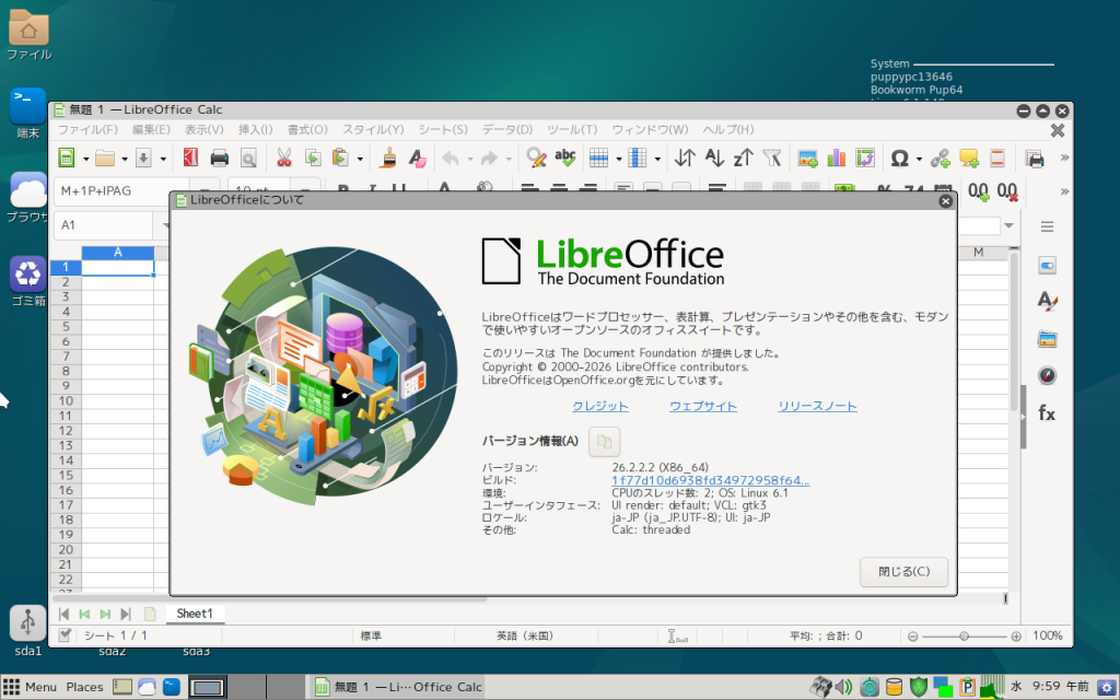 Puppy Linux BookwormPup64 + 日本語フォント に インストールして起動してみた様子は以下の画像。